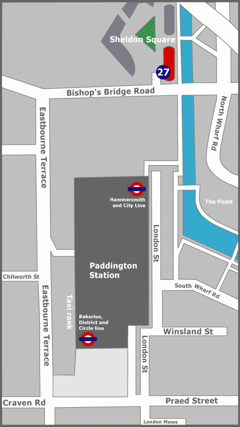 From the Circle, District and Bakerloo Lines Take the exit to Paddington Station. Walk along the back of the station towards platforms 12 – 14 and the Hammersmith and City Line. Go up the stairs/lift and continue past the taxi rank. Upon reaching the exit by the Hammersmith and City Line, turn left as above.
